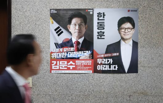 국민의힘 대선 최종 경선에 김문수, 한동훈 후보(가나다순)가 진출한 가운데 30일 국회 국민의힘 사무실 복도에 두 후보의 포스터가 붙어있다. 임현동 기자 |