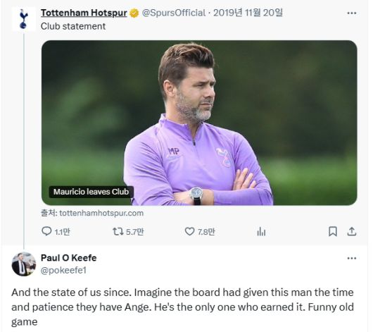 오키프는 30일(한국시간) SNS에 마우리시오 포체티노 당시 토트넘 감독의 경질 소식을 담은 2019년 11월 19일자 기사를 게재하며 의미심장한 의견을 남겨 주목받았다.