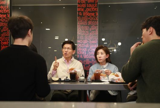 김문수 국민의힘 대선 경선 후보와 나경원 국민의힘 의원이 12일 서울 동작구 맥도날드 중앙대학교점에서 학생들과 간담회를 가지고 있다. [사진=김문수 페이스북] |