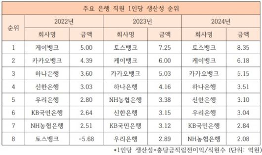 [한국금융신문 우한나 기자] 지난해 주요 은행 가운데 직원 1인당 생산성이 가장 높은 곳은 토스뱅크로 나타났다. 토스뱅크는 임직원 1인당 평균 8억3500만원을 벌어들여 가장 높은 수준의 생산성을 차지했다.