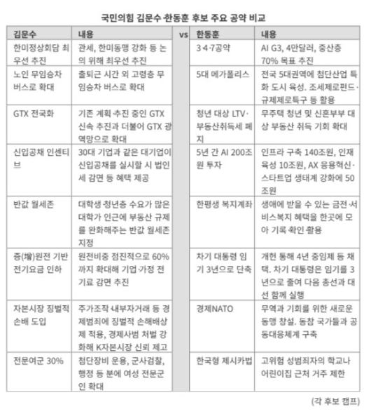 金, 친기업 기조 강조 속 무임승차 확대·반값월세존 등 파격공약 장단 중산층 확대, 청년공약 강조해 온 韓 AI 200조원 등 예산·행정역량 시험대 정치배경·탄핵찬반 등 공방도 지속될 듯