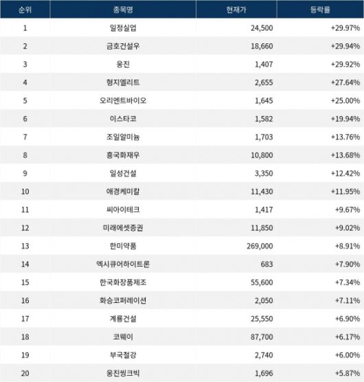 6위 이스타코(015020)는 종가 1,582원으로 +19.94% 급등 마감했다. 7위 조일알미늄(018470)은 종가 1,703원으로 +13.76% 급등 마감했다. 8위 흥국화재우(000545)는 종가 10,800원으로 +13.68% 급등 마감했다. 9위 일성건설(013360)은 종가 3,350원으로 +12.42% 급등 마감했다. 10위 애경케미칼(161000)은 종가 11,430원으로 +11.95% 급등 마감했다.
