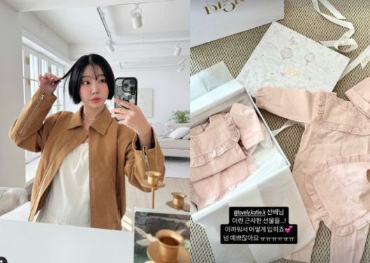 공개된 사진 속에는 아기 옷이 담긴 명품 브랜드 D사의 고급스러운 포장 박스와 함께 핑크색 아기옷이 정성스럽게 포장된 모습이 담겨 있다.