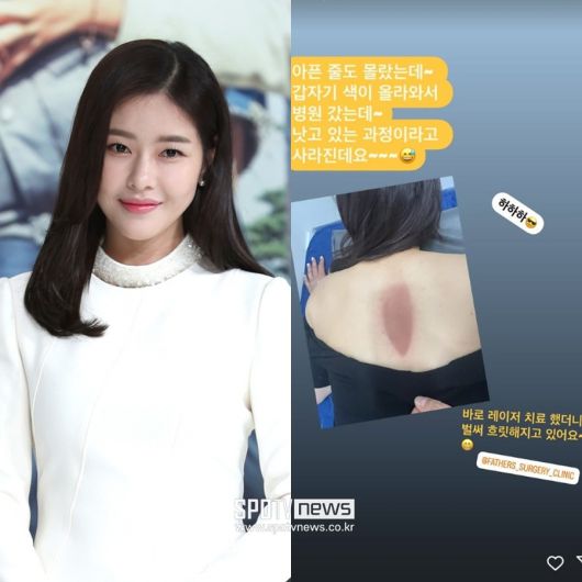 그는 진하게 착색된 등 부분을 공개하며 "아아아 이게 뭐람. 선생님 저 빨리 낫게 해주세요"라며 울상을 지었다.