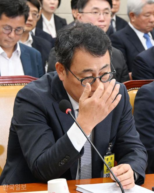 유영상 SK텔레콤 최고경영자(CEO)가 30일 오전 서울 여의도 국회 과학기술정보방송통신위원회에서 열린 YTN 등 방송·통신 분야 청문회에서 SKT 해킹 사태와 관련한 의원의 질의를 듣고 있다. 고영권 기자 |