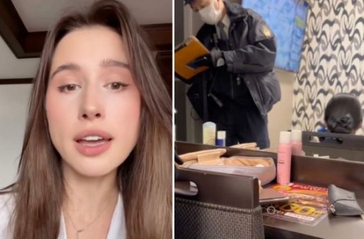 홀로 일본 여행 중이던 이 여성(왼쪽)이 도쿄에 있는 유명 호텔에 투숙했다가 침대 아래에 숨어 있던 낯선 남성과 마주친 경험을 공유했다. 오른쪽은 객실에 출동한 현지 경찰의 모습. 나탈리시 탁시시 인스타그램 캡처 |