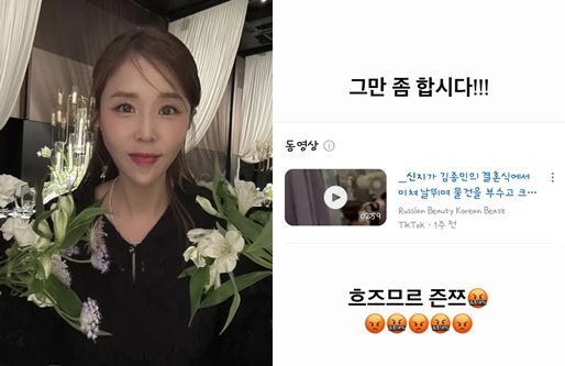신지가 함께 올린 사진에는 틱톡 캡처화면이 담겨있다. 틱톡의 한 사용자는 ‘신지가 김종민의 결혼식에서 미쳐날뛰며 물건을 부수고...’라는 제목의 영상을 올린 모습이다. 클릭을 유도하는 자극적인 제목에 신지는 “그만 좀 합시다‘ ’하지 마라 진짜‘라고 덧붙이며 분통을 터뜨렸다.
