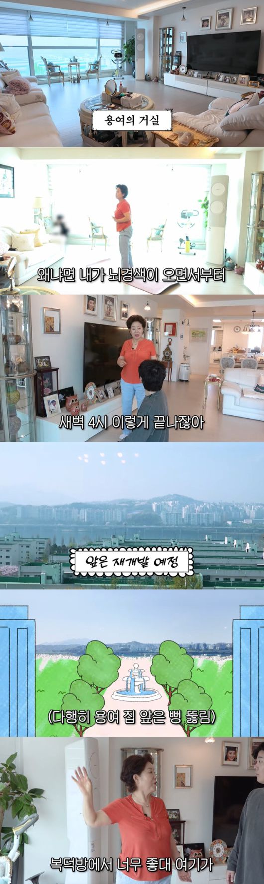특히 선우용여의 집 앞에는 낮은 층수의 아파트들이 있어서 한강이 한 눈에 들어왔다. 이에 선우용여는 "우리 아파트 앞은 재개발이 될 예정이다. 길이 된다고 한다"고 설명하며 "복덕방에서도 우리 집 위치가 좋다고 하더라"고 자랑했다.