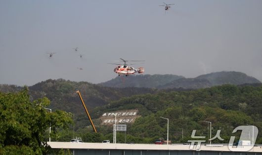 대구 북구 함지산 산불 이틀째인 29일 오전 현장에 투입된 산불 진화 헬기가 주불 진화에 총력을 쏟고 있다. 2025.4.29/뉴스1 ⓒ News1 공정식 기자 |