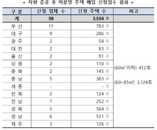 30일 LH는 지방 준공 후 미분양 주택에 대한 매입신청을 접수한 결과, 총 58개 업체 3536가구 주택이 접수됐다고 밝혔다.