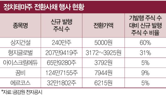 테마주 투기 열기에 편승해 전환사채(CB)를 주식으로 전환하는 사례도 속출한다. 금감원 전자공시에 따르면, 지난 4월 4일부터 23일까지 나온 전환청구권행사 공시 25건 가운데 11건이 정치테마주 관련 기업에서 나왔다. 주가가 이상 급등하자 CB를 주식으로 전환해 일제히 차익 실현에 나선 것. 테마주에 올라탄 투자자는 ‘물량 폭탄’을 고스란히 떠안을 처지다.