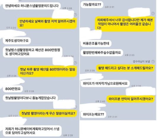 이어 A씨는 촬영을 문의한 한 고객과 나눈 메시지 내용을 공개했다. 이에 따르면 고객 B씨는 A씨에게 “제주도에서 첫날밤 스냅 촬영을 원한다”며 “예산은 800만원 정도 생각하고 있다”고 의뢰했다.