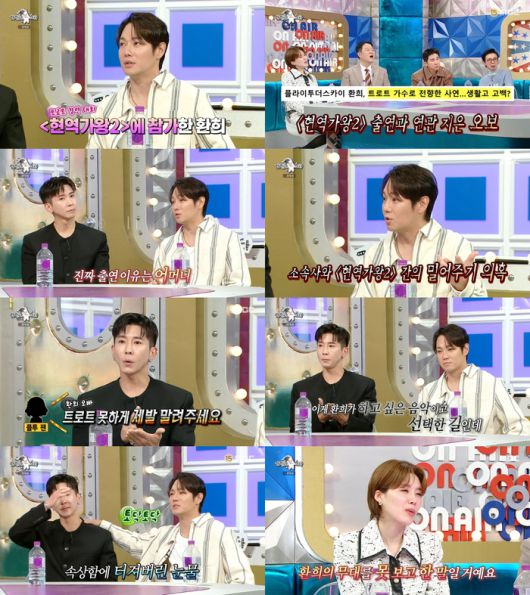 이날 환희는 ‘현역가왕2’에 참여하며 트로트에 도전하게 된 것을 언급했다. 환희는 “작년 여름부터 섭외가 들어와서 고민을 많이 했다. (트로트는) 내가 할 수 있는 장르가 아니라고 생각했다”고 털어놨다.