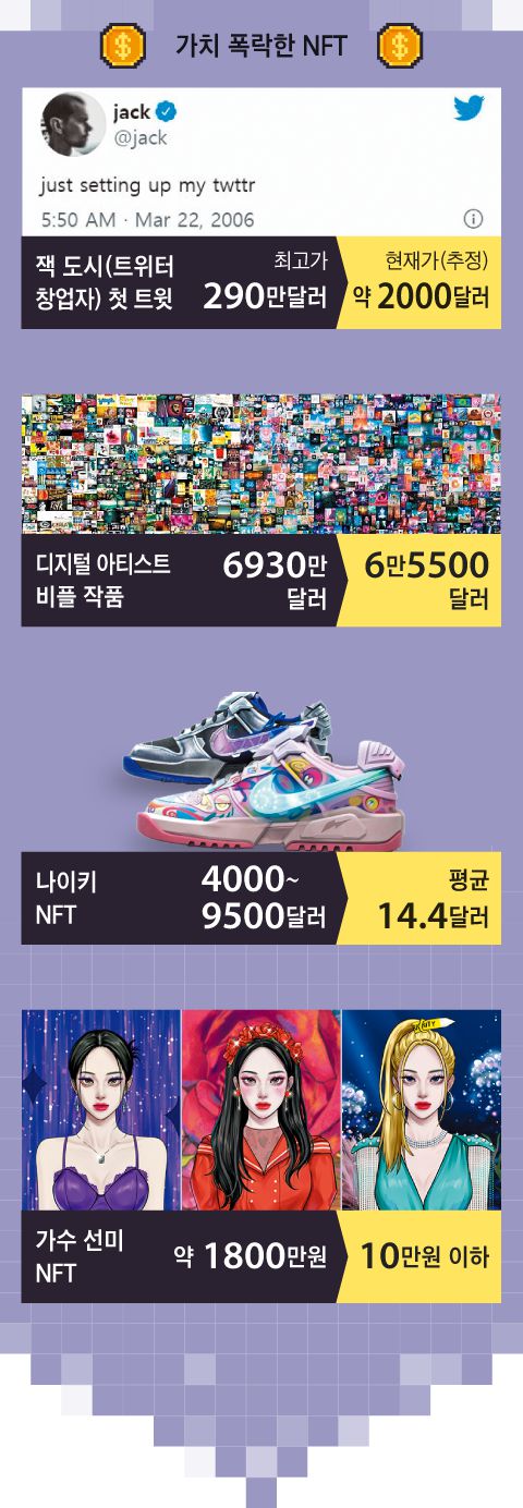NFT 가치가 폭락한 것은 지나친 투기 열풍의 후폭풍이라는 평가다. NFT 자체는 이미지·영상 파일의 소유권을 증명하는 것에 불과하다. 하지만 NFT로 발행된다는 이유로 예술품 가치가 과대평가받는 경우가 많았다. 투기 열풍이 가라앉으면서 원래 가치대로 평가를 받고 있다는 것이다. 업계 관계자는 “NFT 시장 초기에는 ‘지금 아니면 늦는다’ ‘나만 안 사면 안 된다’는 투기 심리로 시장이 과열됐고, 터무니없이 비싼 값에 NFT가 팔렸다”며 “팬데믹 이후 전반적 투자 심리마저 위축되면서 거품이 걷혔다”고 했다.