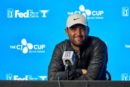세계랭킹 1위 스코티 셰플러가 더 CJ컵 바이런 넬슨 기자회견에서 취재진의 질문을 듣고 있다. CJ그룹