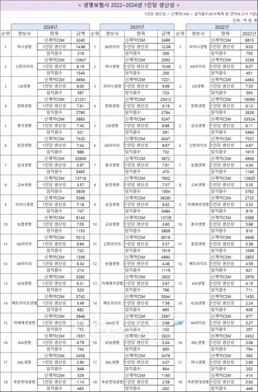 하나생명은 2022년 임직원수는 200명으로 낮은 수준 이었으나 신계약CSM이 565억원으로 1000억원이 되지 않아 생산성이 2억8000만원으로 18개사 중 16위를 기록했으나 2023년 신계약CSM이 2092억원으로 2022년 대비 4배 가량 증가하면서 10억4600만원으로 2위로 올랐다.