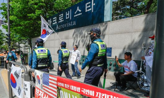 어수선 건진법사 전성배씨의 청탁 및 금품 제공 의혹 등을 규명하기 위해 검찰이 윤석열 전 대통령 사저 압수수색에 나선 30일 서울 서초구 아크로비스타 사저 앞 도로 구조물에 태극기와 윤 전 대통령 지지 게시물 등이 어지럽게 나붙어 있다. 최상수 기자 |