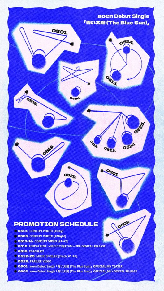 아오엔은 지난달 29일 팀 공식 SNS에 '프로모션 스케줄' 이미지를 게재했다. 이에 따르면 1일에 이어 5일 아오엔의 콘셉트 사진, 13~14일 콘셉트 비디오가 공개된다. 16일에는 아오엔의 탄생 과정을 담은 오디션 프로그램 시그널송 '피니시 라인 라스트 레이스, 뉴 스타트'의 음원이 발매된다. 이어 19일 데뷔 싱글 트랙리스트, 22~25일 음원 스포일러 콘텐츠, 29일 트레일러 비디오 등이 순차적으로 베일을 벗는다. 6월 2일에는 '더 블루 선' 뮤직비디오가 선공개되며 데뷔 열기에 불을 지핀다.
