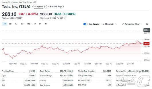 일단 테슬라는 3.38% 급락한 282.16달러를 기록했다.