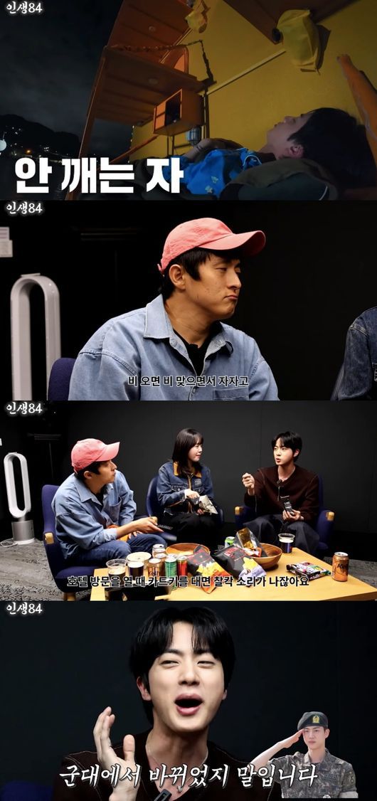 홀로 아침까지 노천 침상에서 잠을 잔 진에 기안84는 “안 불편하냐. 석진아. 다른 애들은 몸을 조금 뒤척인다. 근데 석진이는 완전 FM 이렇게 (잔다)”라며 놀라워했다. 이에 진은 “저 원래 되게 잘 깬다. 투어를 많이 다니니까 호텔 방문을 열 때 카드키를 대면 찰칵 소리 나지 않냐. 그 소리에도 깬다”라고 털어놨다.