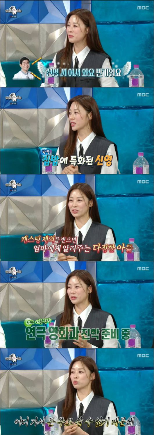 장신영은 "얘가 (기획사와) 미팅을 했으면 좋겠다 하면 제가 매니저가 돼서 애 데리고 다녀온 적도 있었다"며 "지금 연기 준비하려고 연극영화과로 학교를 가려 한다"고 밝혔다. 하지만 아직 기획사에 들어가는 건 반대한다고. 장신영은 "그 나이에 할 수 있는 걸 누려봤으면 좋겠다"며 "연기를 전공하려 하다 보니까 저랑 연기에 대한 얘기를 많이 한다. 제가 그런 얘기를 하면 '엄마 말이 맞는 거 같다'면서 수긍도 해준다. 그런 얘기를 하면 12시 넘어서도 통화한다"고 밝혔다.