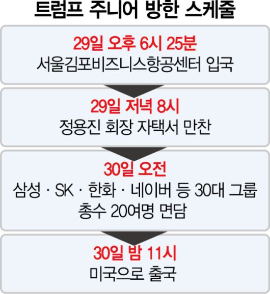 이날 업계에 따르면 트럼프 주니어는 전날 오후 6시 25분께 서울김포비즈니스항공센터를 통해 입국해 정용진 신세계그룹 회장 자택에서의 만찬을 시작으로 1박 2일간의 짧은 일정을 소화했다. 트럼프 주니어는 이날 이른 아침부터 재계 총수들과 잇따라 면담을 가졌다. 관계자 외 접근이 차단된 조선팰리스호텔 내 보안 구역에서 진행됐으며 총수들은 해당 구역으로 향하는 ‘핫라인’을 이용하는 등 극비리에 이동했다. 대기업의 경우 개별 회동, 중견기업은 집단 회동으로 각각 30분~1시간가량 진행했다. 이후 트럼프 주니어는 오후 11시 30분께 인천공항을 통해 미국으로 출국했다. 30시간이 채 안 되는 짧은 시간 동안 한국의 주요 그룹 총수들을 두루 만난 것이다.