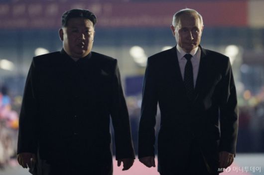 블라디미르 푸틴 러시아 대통령이 지난해 6월19일 베트남으로 출발을 하기 전에 평양 순안 공항에서 열린 작별식에 김정은 북한 국무위원장과 참석을 하고 있다. / AFP=뉴스1 |