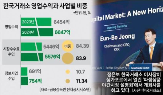 지난해 거래소 전체 영업수익은 6647억원이었다. 이 중 거래수수료, 청산결제수수료 등을 포함한 시장수수료 수입이 5576억원으로 영업수익 가운데 84%를 차지했다. 데이터사업부와 인덱스사업부 수익이 포함된 정보사업 수입은 11%인 754억원에 그쳤다.