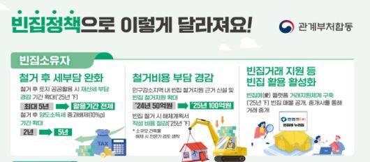 끝으로 민간이 빈집을 정비·활용할 수 있도록 관련 제도를 개선하고 재산세 등 빈집 관련 비용 부담도 낮춘다. 빈집 소유자가 자발적 정비를 하지 않는 요인이었던 빈집 철거 이후 세금 부담이 증가하는 문제를 해결하기 위해 철거 후 토지 공공활용 시 재산세 부담완화 적용 기간을 현행 5년에서 공공활용 기간 전체로 확대한다. 또 빈집 철거 후 비사업용 토지에 대한 양도소득세 중과세율(10%포인트) 배제 기간을 기존 2년에서 5년으로 확대한다.