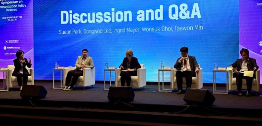 지난달 24일 질병관리청 \'2025 세계예방접종 주간 기념 국제 심포지엄\' 당시 패널토론 모습. 왼쪽부터 박수은 양산부산대병원 소아청소년과 교수(대한소아감염학회 회장), 이동우 질병청 예방접종관리과장, 잉그리드 메이어 호주 보건부 국가예방접종 전략·운영과장, 최원석 고려대 안산병원 감염내과 교수, 민태원 국민일보 부국장. 최지현 기자 |