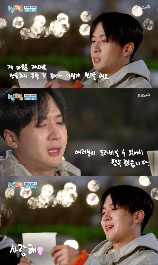 라비는 “공황 때문에 숨도 편안히 못 쉬던 날이 많았는데 ‘1박 2일’을 만난 덕분에 정말 많이 변할 수 있었다”라며 “여러분과 함께라서 여기까지 올 수 있었던 것 같다”고 눈물을 보였다.