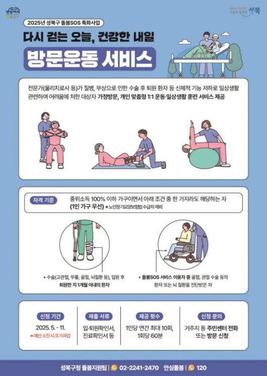 성북구는 여기에 방문 운동 서비스, 복지용구 대여 서비스 등 2개 신규 서비스를 추가 도입한다. 방문 운동 서비스는 전문가가 가정을 방문해 1:1 맞춤형 운동을 제공한다. 복지용구 대여 서비스는 휠체어, 침대 등 7종의 용구 중 필요한 품목을 최대 3개월간 무상 대여할 수 있도록 지원한다.