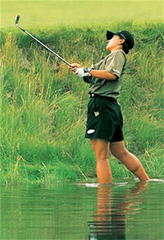 박세리가 1998년 US여자오픈 연장전 당시 18번홀에서 연못에 들어가 트러블 샷을 하고 있는 장면. 골프매거진 |