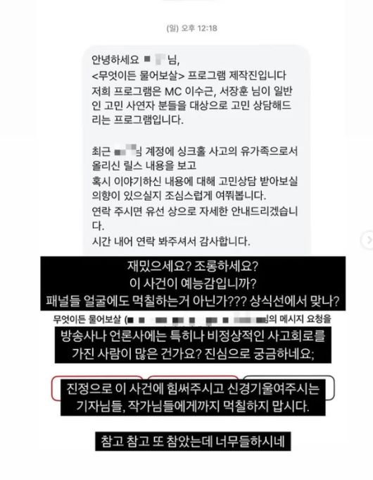 제작진은 "저희 프로그램은 MC 이수근, 서장훈 님이 일반인 고민 사연자 분들을 대상으로 고민 상담해드리는 프로그램이다"며 "최근 싱크홀 사고의 유가족으로서 올리신 릴스 내용을 보고 혹시 이야기하신 내용에 대해 고민상담 받아보실 의향이 있으실지 조심스럽게 문의드린다"고 했다.