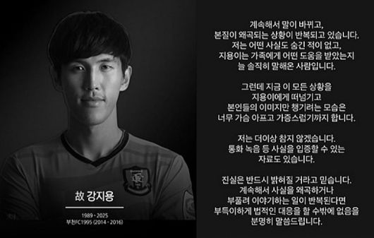 지난달 22일 세상을 떠난 축구선수 출신 고(故) 강지용씨(왼쪽) 아내가 지난달 30일 인스타그램에 올린 글. /부천FC, 이다은씨 인스타그램 |