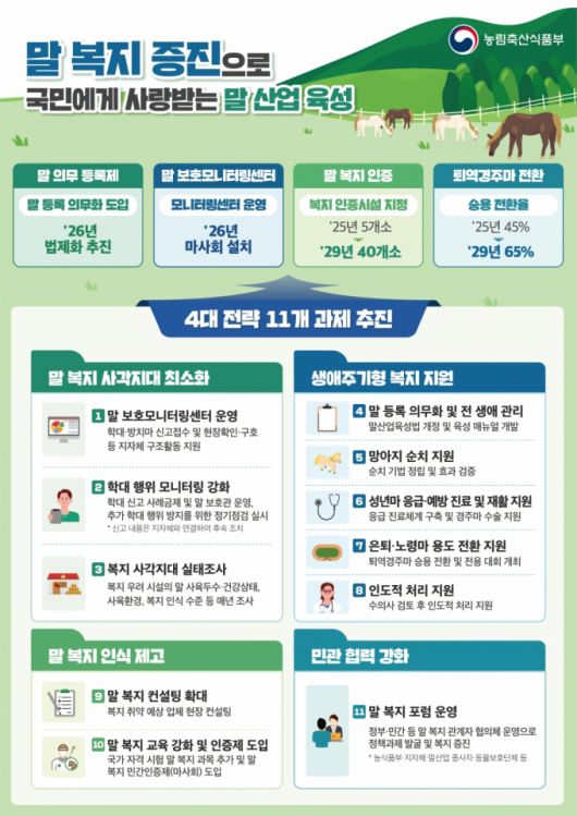 1일 농림축산식품부에 따르면 오는 2029년까지 추진되는 '2025 말 복지 제고 대책'은 국민에게 사랑받는 말산업 육성을 목표로 말 복지 사각지대 최소화, 생애주기형 복지 지원, 말 복지 인식 제고, 민관협력 강화 등 4개분야 11개 과제를 담고 있다.