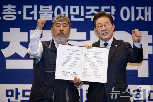 (서울=뉴스1) 이재명 기자 = 이재명 더불어민주당 대통령 후보와 김동명 한국노총 위원장(총괄선거대책위원장)이 1일 오후 서울 중구 프레스센터에서 열린 한국노총 정책협약식에서 협약서에 서명한 후 기념 촬영을 하고 있다. 2025.5.1/뉴스12expulsion@news1.krCopyright ⓒ 뉴스1. All rights reserved. 무단 전재 및 재배포, AI학습 이용 금지.
