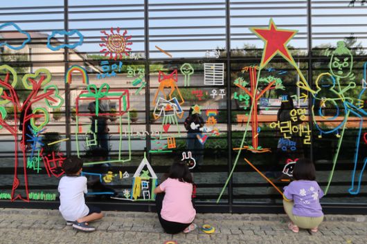 용인 백남준아트센터의 거울 같은 외벽에 마음껏 테이프를 붙여 그림 그리는 어린이들. 사진 경기문화재단 |