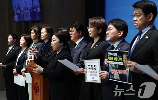 (서울=뉴스1) 김민지 기자 = 조국혁신당 황운하 원내대표를 비롯한 박은정 의원 등이 1일 서울 여의도 국회 소통관에서 한덕수 대통령 권한대행이 최근 어려운 이웃을 위해 1000원 백반을 제공하는 식당에 사비로 기부 한 것에 대해 "공직선거법 위반"이라며 고발 기자회견을 하고 있다. 2025.5.1/뉴스1