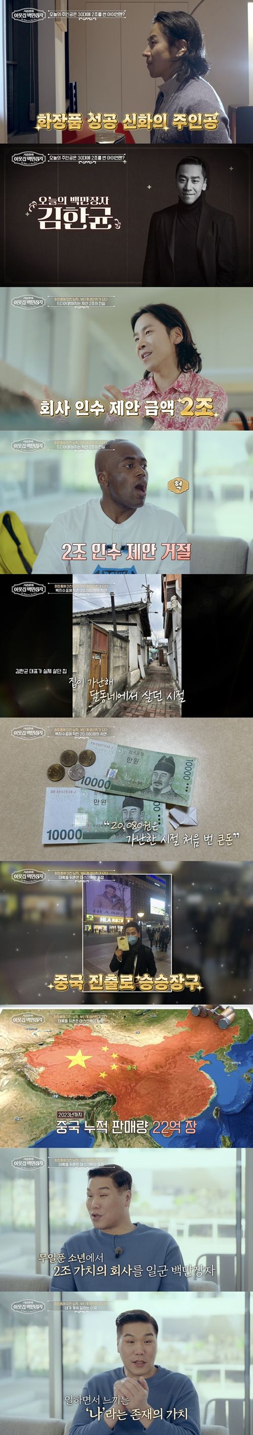 30일 방송된 EBS, E채널 공동 제작 '서장훈의 이웃집 백만장자'(이하 '이웃집 백만장자')에서는 'K-뷰티 성공신화의 주인공' 김한균이 출연해 자신의 인생 이야기를 들려줬다. 하루 최저 임금 20,800원을 받던 가난한 화장품 가게 아르바이트생에서 2조 가치의 기업을 이끄는 CEO로 성장하기까지, 그가 거쳐온 집념과 도전의 이야기가 많은 이들에게 귀감이 됐다.