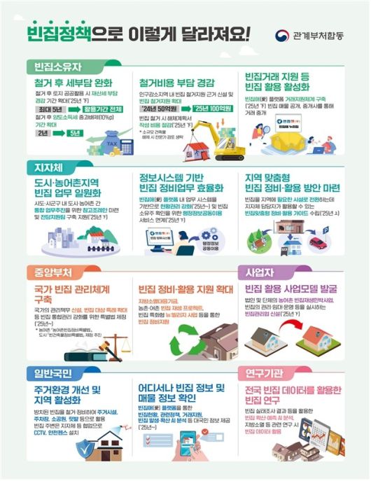 우선 빈집 정비를 체계화하기 위해 ‘농어촌빈집정비특별법’과 ‘빈건축물정비특별법’을 제정한다. 이번 특별법을 바탕으로 그동안 시군구에 맡겨진 빈집 관리를 국가, 시군구, 소유자가 함께 책임지는 구조로 바꾼다.