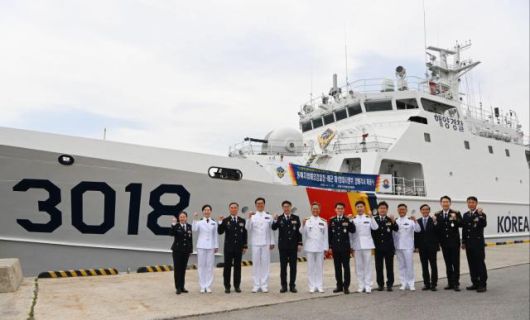 관계자들이 1일 오전 11시 동해 해군군항에 정박 중인 해경 3018함에서 기념촬영을 하고 있다. [사진=동해해경청] |