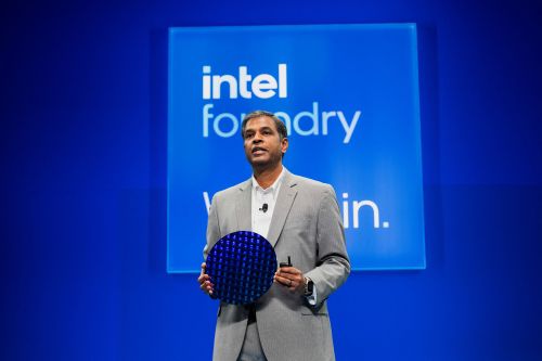 나가 찬드라세카란 인텔 파운드리 최고기술·운영 책임자가 4월 29일(현지시간) 미국 캘리포니아 산호세에서 열린 인텔 연례 제조기술 컨퍼런스에서 연설하고 있다. 로이터 연합뉴스 |