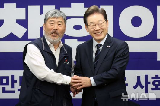 [서울=뉴시스] 조성우 기자 = 이재명 더불어민주당 대선후보가 1일 오후 서울 중구 한국프레스센터에서 열린 한국노총 정책협약식에서 김동명 한국노총 위원장과 기념촬영을 하고 있다. 2025.05.01. xconfind@newsis.com |