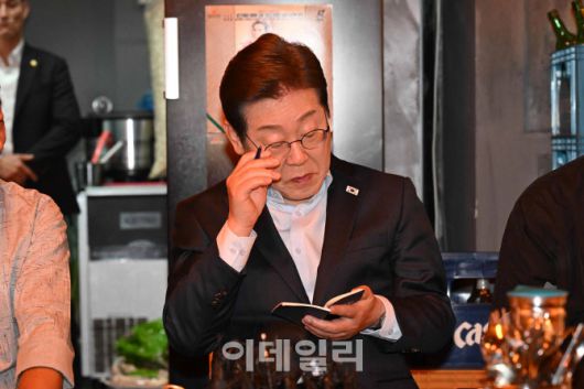 [이데일리 노진환 기자] 이재명 더불어민주당 대선 후보가 1일 서울 종로구의 한 음식점에서 열린 비전형 노동자 간담회에 참석해 수첩을 살펴보고 있다.대법원 전원합의체는 이날 이 후보에게 무죄를 선고한 원심판결을 파기하고 사건을 서울고법으로 돌려보냈다.