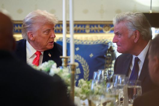 도널드 트럼프 미국 대통령과 측근 린지 그레이엄 상원의원이 만찬 도중 대화하고 있다. |