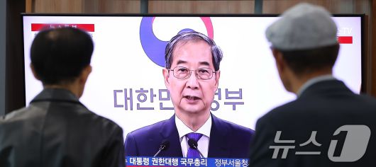 (서울=뉴스1) 박지혜 기자 = 시민들이 1일 오후 서울역 대합실에서 한덕수 대통령 권한대행 국무총리의 대국민담화 발표 생중계 영상을 시청하고 있다. 이날 한 대통령 권한대행 국무총리는 대국민 담화를 통해 대통령 권한대행 국무총리직을 사퇴하겠다고 밝혔다. 2025.5.1/뉴스1