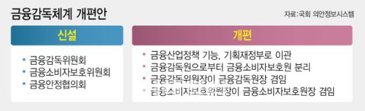 금융감독체계 개혁 방안은 김현정 민주당 의원이 대표 발의한 ‘금융위원회의 설치 등에 관한 법률’ 개정안을 기초로 논의했다. 김 의원이 발의한 개정안의 핵심은 국무총리 소속의 ‘금융감독위원회’와 ‘금융소비자보호위원회’를 설치하고 금융정책기능은 기획재정부로 이관해 현 금융당국의 기능을 시장감독에 집중한다는 것이다.