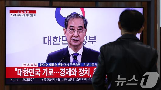 시민들이 1일 오후 서울역 대합실에서 한덕수 대통령 권한대행 국무총리의 대국민담화 생중계 영상을 시청하고 있다. 2025.5.1/뉴스1 ⓒ News1 박지혜 기자 |