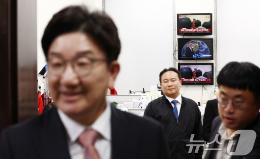 이재명 더불어민주당 대통령 후보의 공직선거법 위반 사건에 대해 대법원이 유죄 취지 파기환송 판결을 내린 가운데 1일 서울 여의도 국회에서 권성동 국민의힘 원내대표가 브리핑을 하기 위해 나오고 있다. 2025.5.1/뉴스1 ⓒ News1 김민지 기자 |